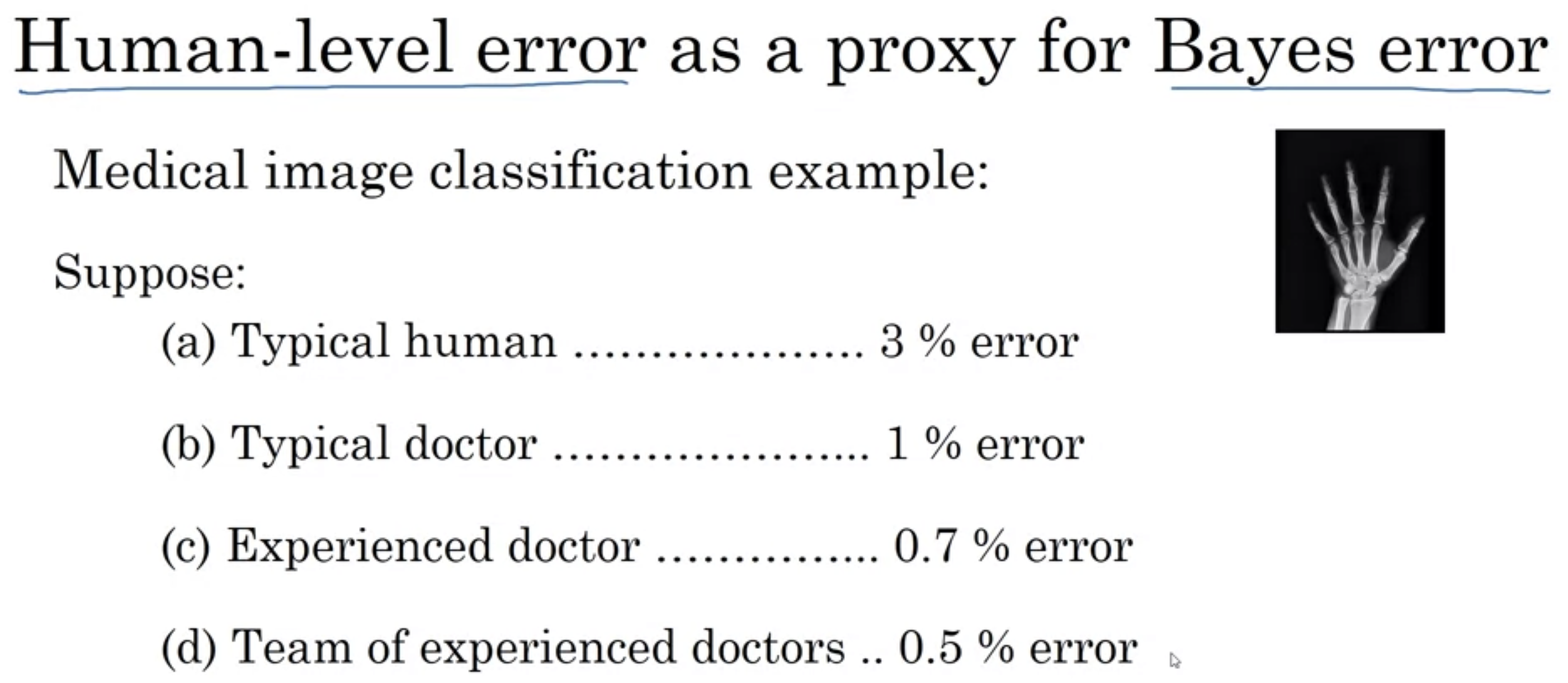 Human-level error는 proxy for bayes error를 통해 구할 수 있다.