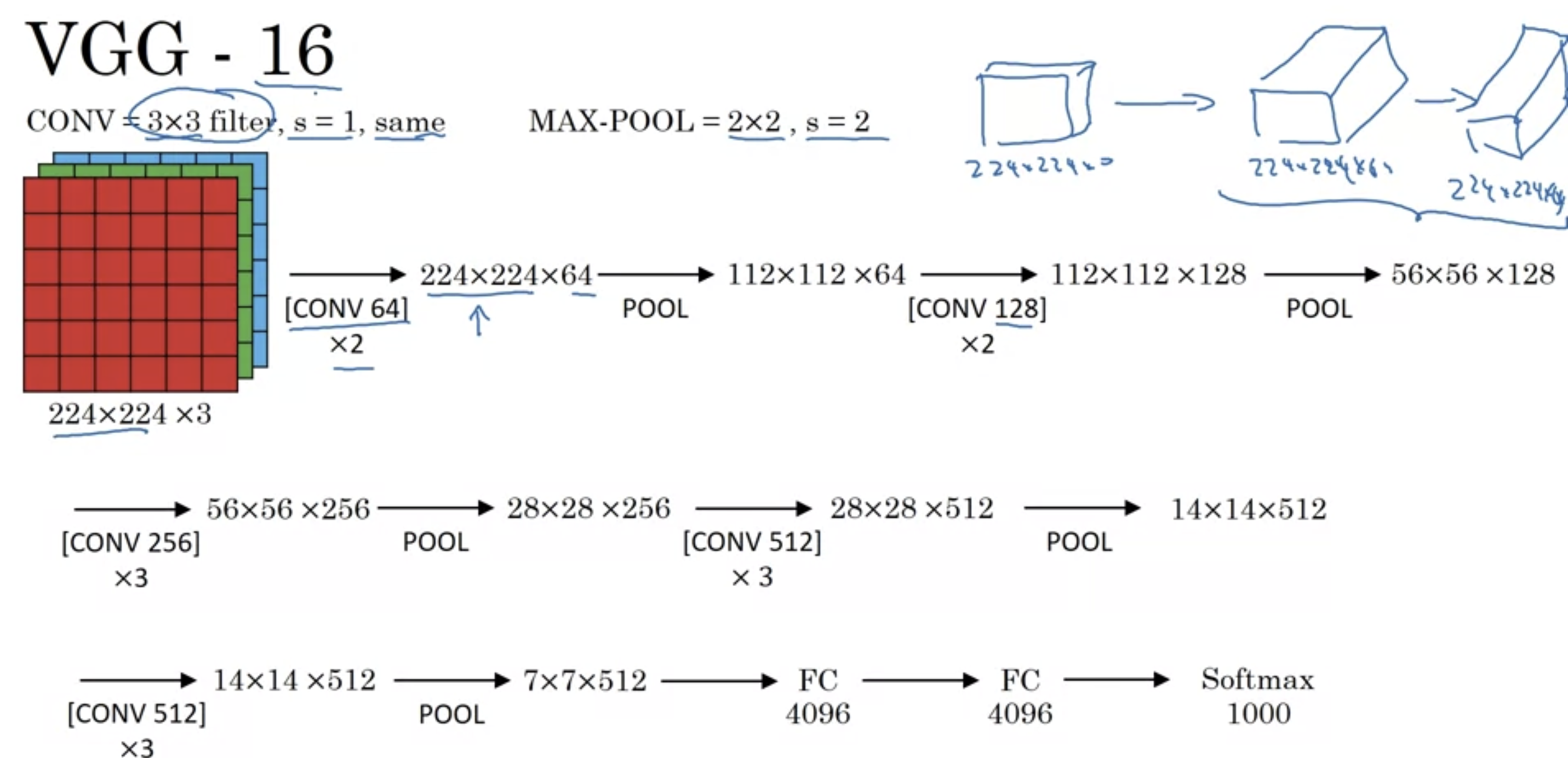 height, width가 2배 감소하는동안 number of channels는 2배 증가.