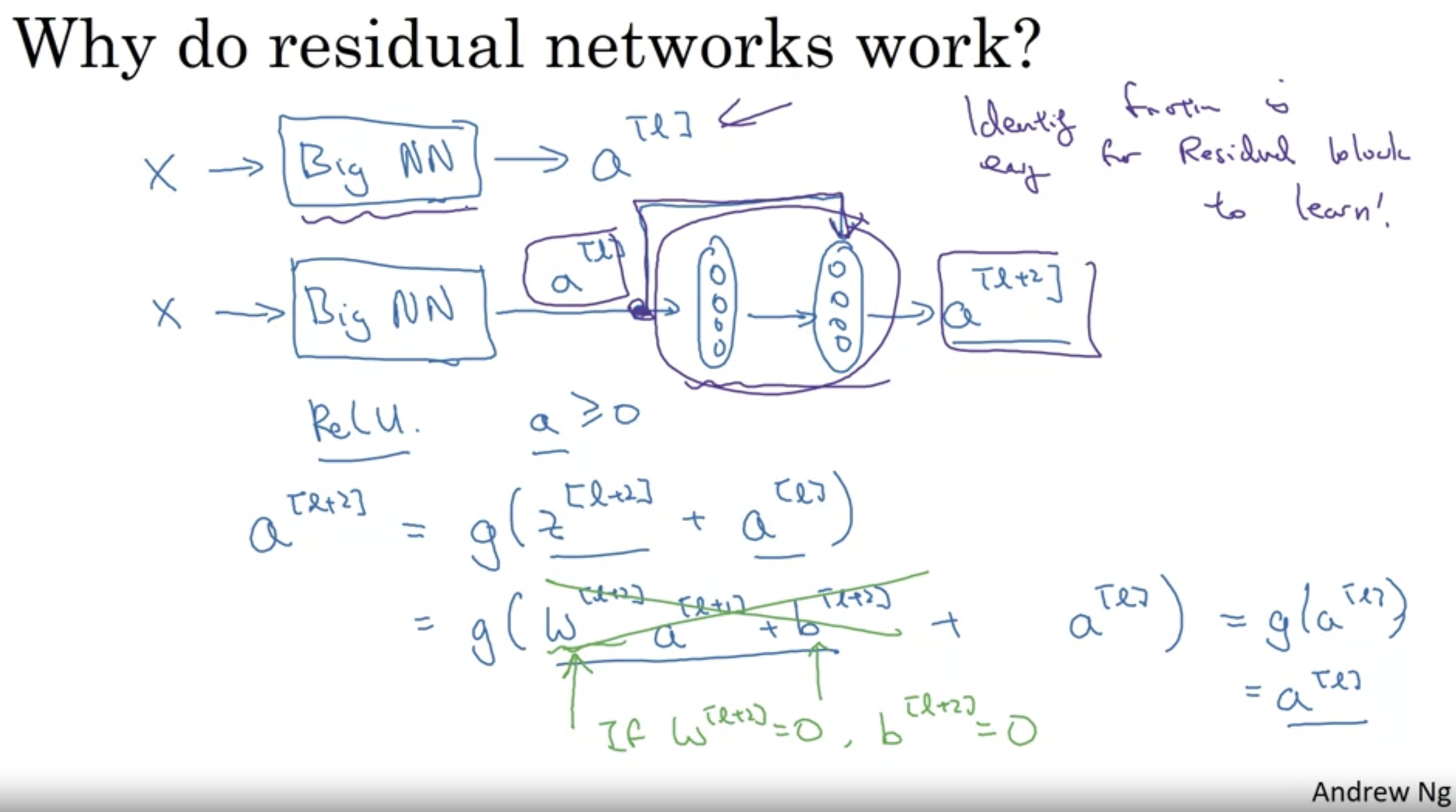 - if no padding convolution을 사용할 경우, residual block에서 A[l]을 추가하는 거 대신 np.dot(W(s),A[l])을 추가하면 된다.
