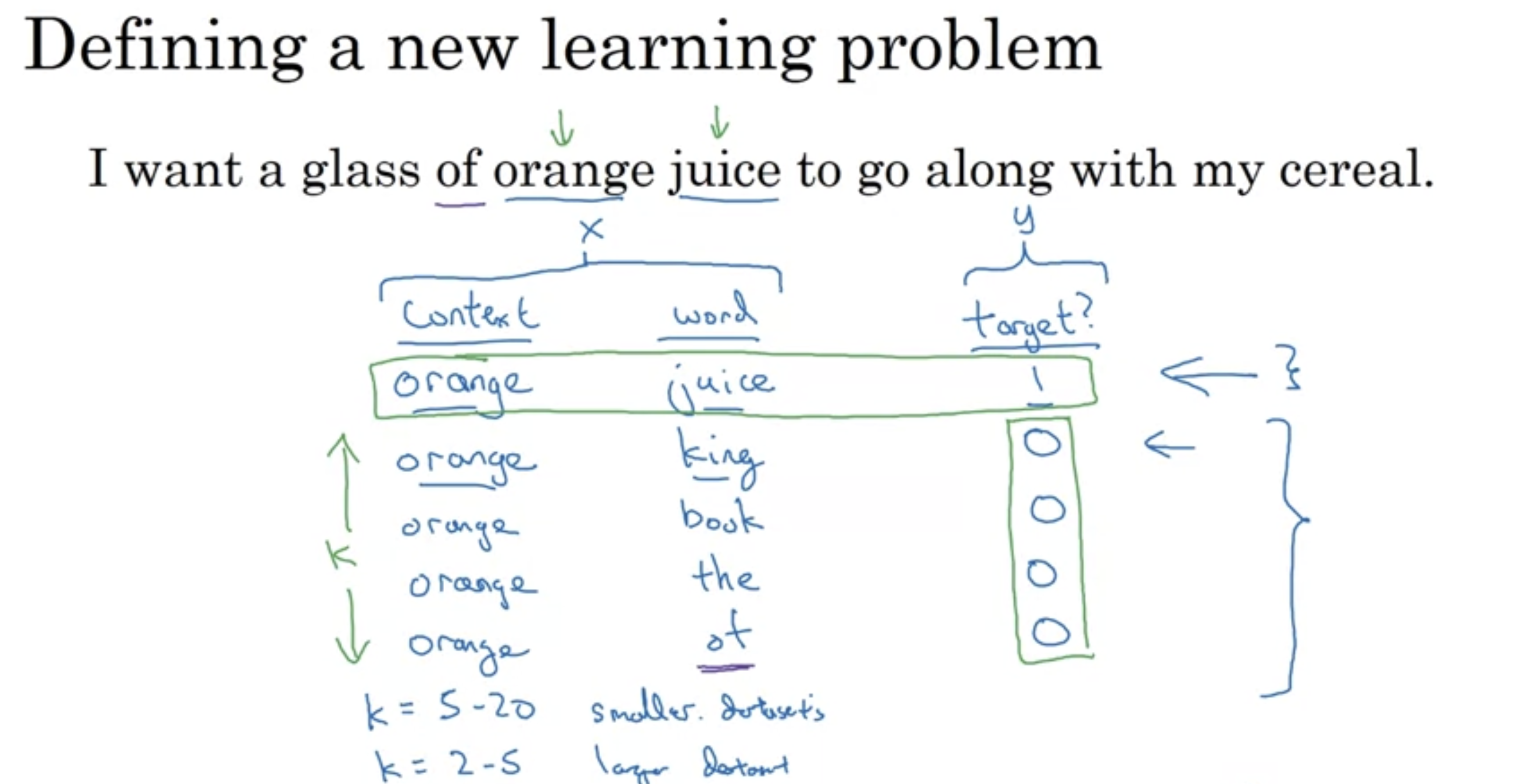 10,000(vocabulary size)에 대해 softmax 보다, 10,000에 대해 sigmoid(binary classification) 계산비용이 훨씬 싸다. -> 왜인진 모르겠음