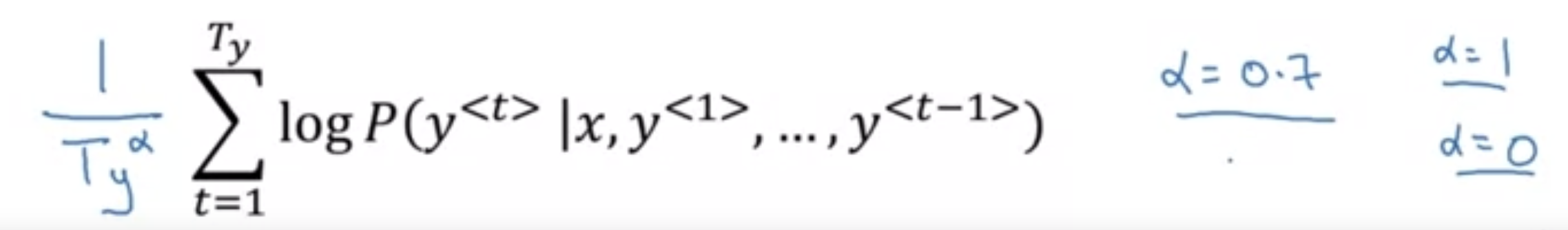 이때 log로 변환하더라도 실제 p는 1보다 작기 때문에 log 함수에서도 음수의 결과값을 가르키게 되는데 이는 output의 시퀀스를 짧게 만드는 경향을 주기도 한다.