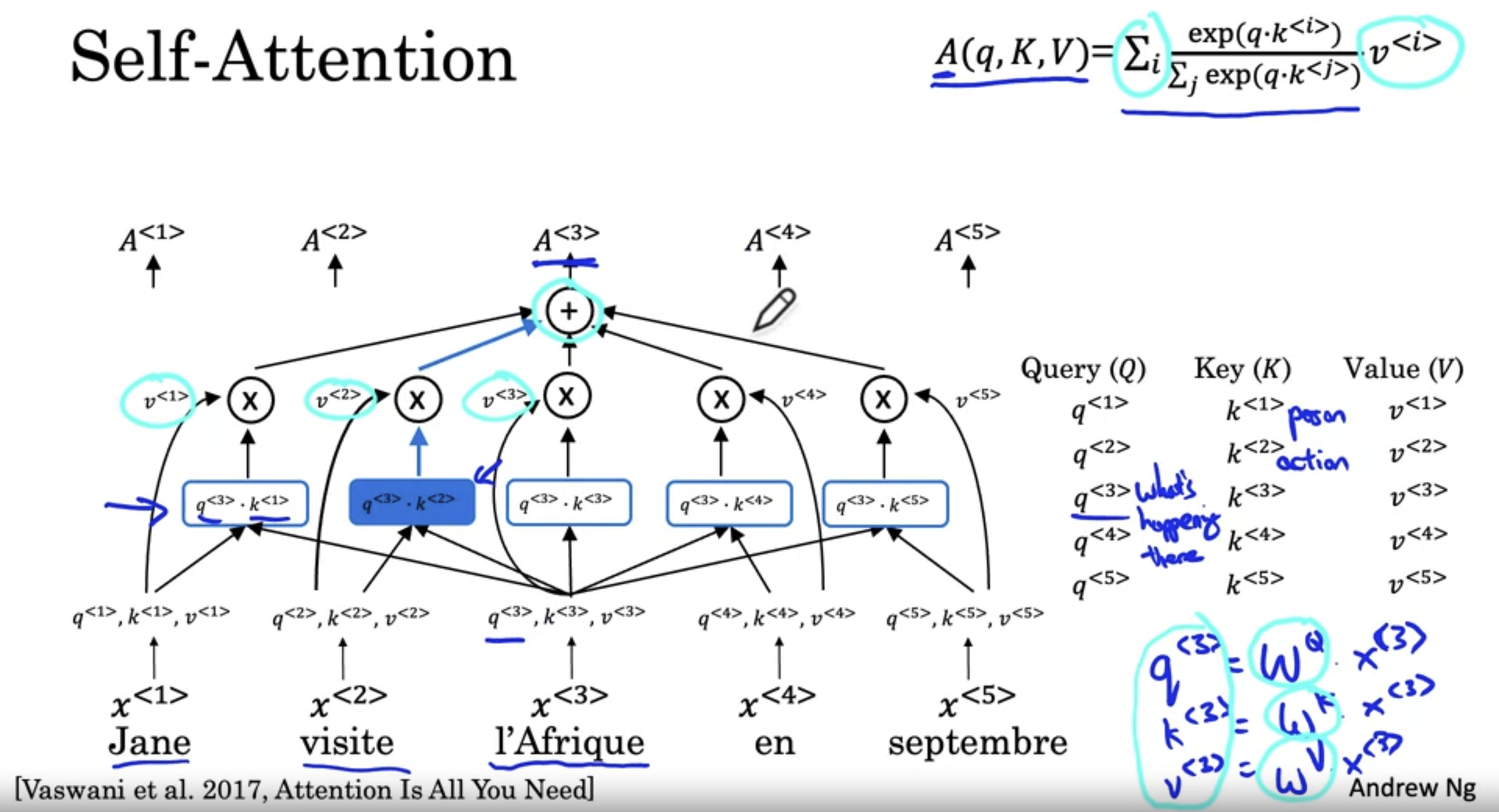 - 이때 목적지인 I'Afrique에 대해 visite이 가지는 중요성이 매우 커지고, 따라서 오른쪽 위 수식에 따라 softmax값은 파란색 부분이 가장 클 것으로 예상할 수 있다.
