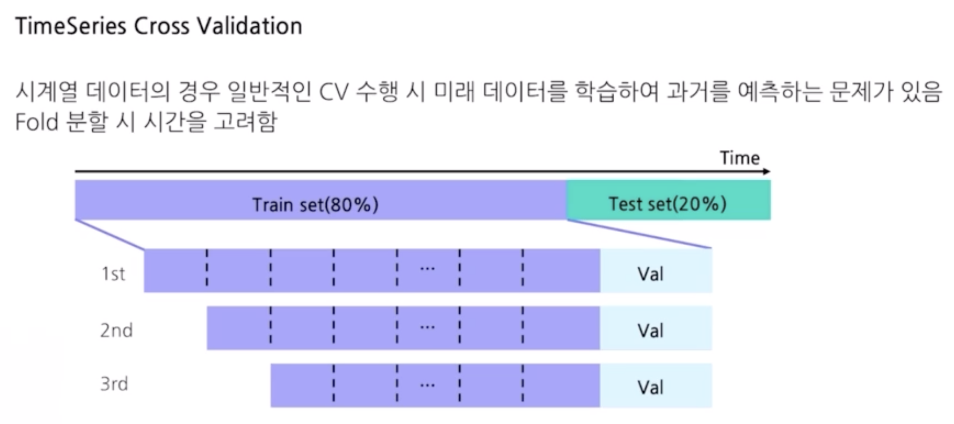 - 일반적으로 K-Fold를 적용하게 되면 시간순서가 섞이므로 data leakage 문제 발생.
