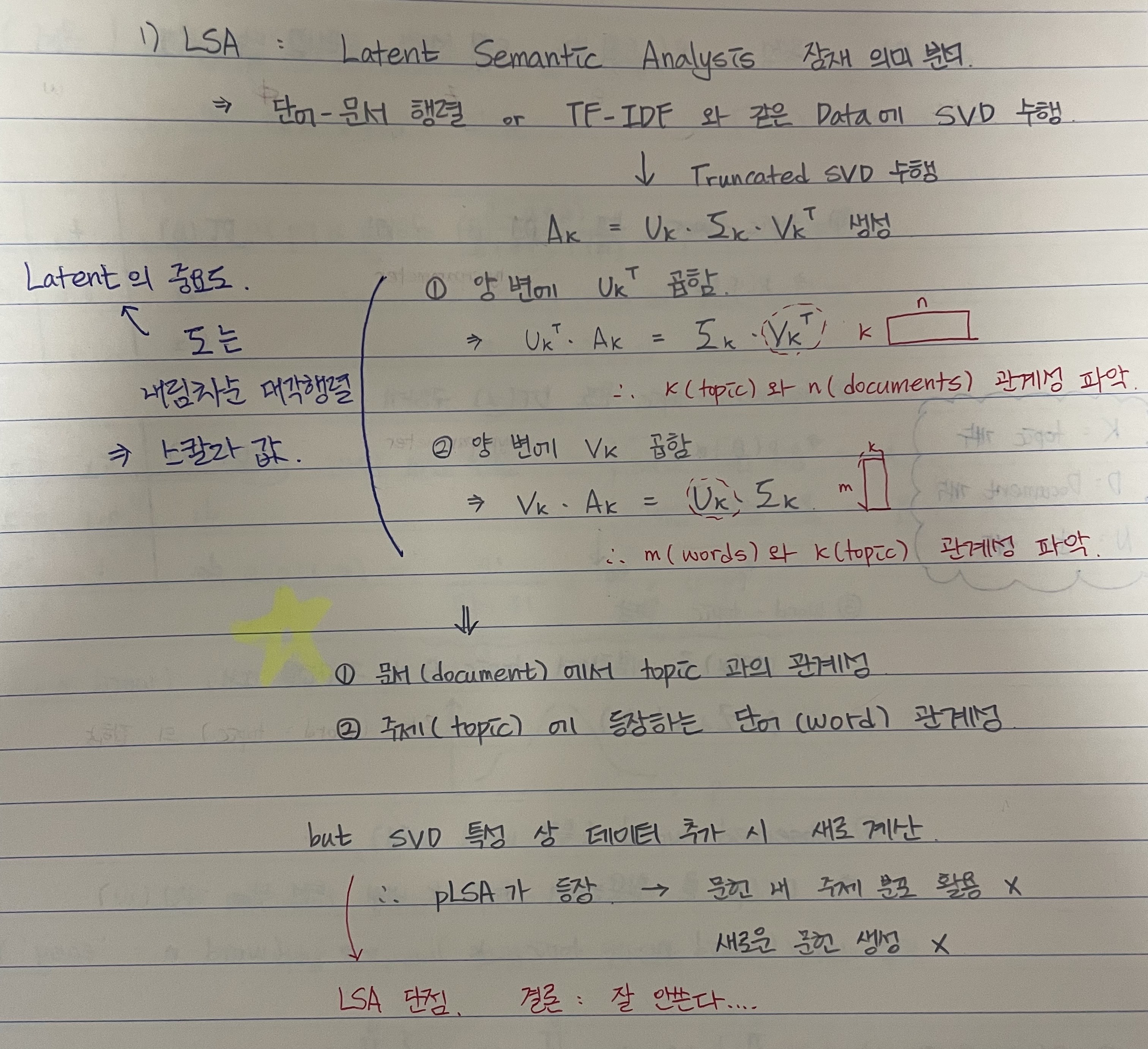 - LSA : DTM을 truncated SVD를 통해 축소하여 축소 차원에서 근접 단어들을 토픽으로 묶는다.